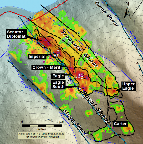 The 2021 program is designed to follow-up on the exploration success of the 2020 program that returned near surface drill intersections such as 12.2 metres (“m”) of 9.70 grams per tonnes (“gpt”) gold at the Eagle Zone and 4.6 m of 7.23 gpt gold at the Imperial Zone. The 2021 program will also test for the bedrock source of coincidental soil and biogeochemical targets including soil sample values of 5.55 parts per million (“ppm”) and 8.42 ppm gold at the Senator-Diplomat showing, and 11 ppm gold at the Crown showing.