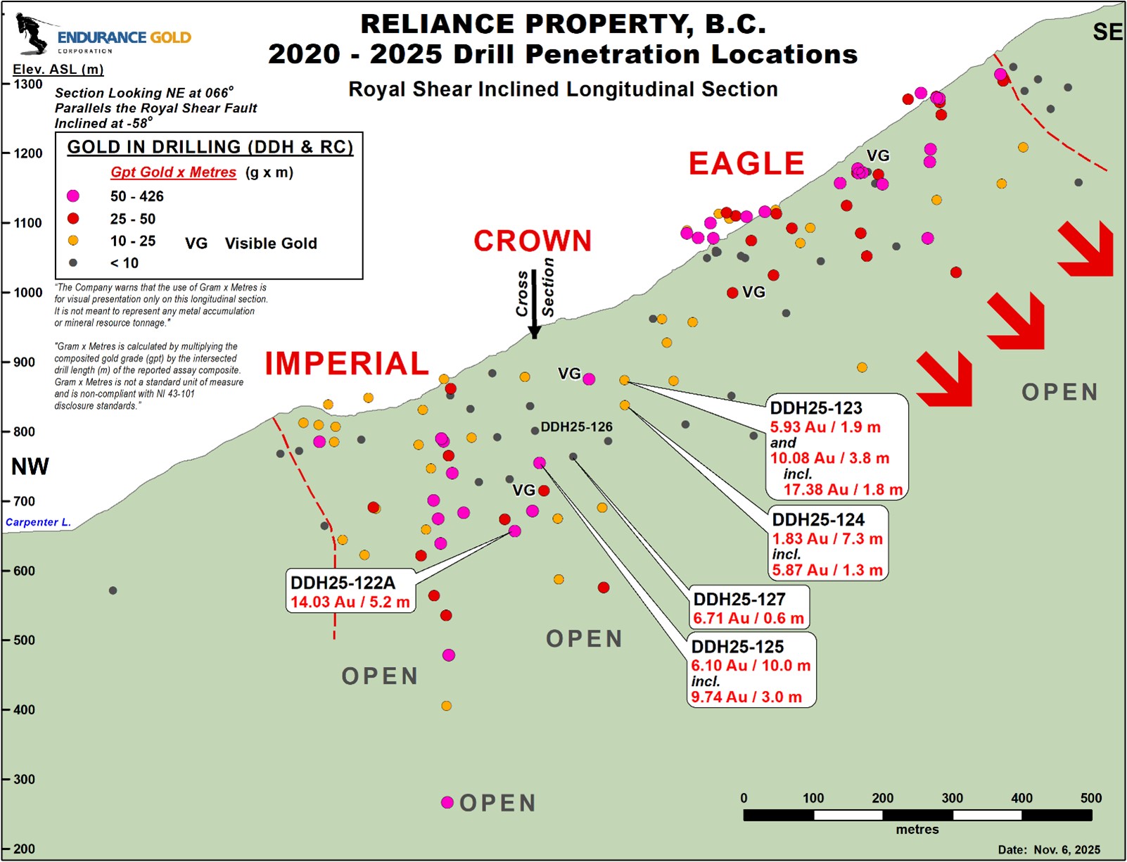 The 2025 drilling program was designed to test the Crown “Gap”, a previously insufficiently drilled section of the Royal Shear connecting the Imperial and Eagle Zones. The program was successful in achieving encouraging intersection statistics within the Crown Gap with 13 drill holes intersecting greater than 10 gram*metres. Several of the 2025 holes returned multiple gold interceptions. The intersection statistics in the Crown Gap are consistent with prior high success statistics at the Eagle and Imperial Zones.