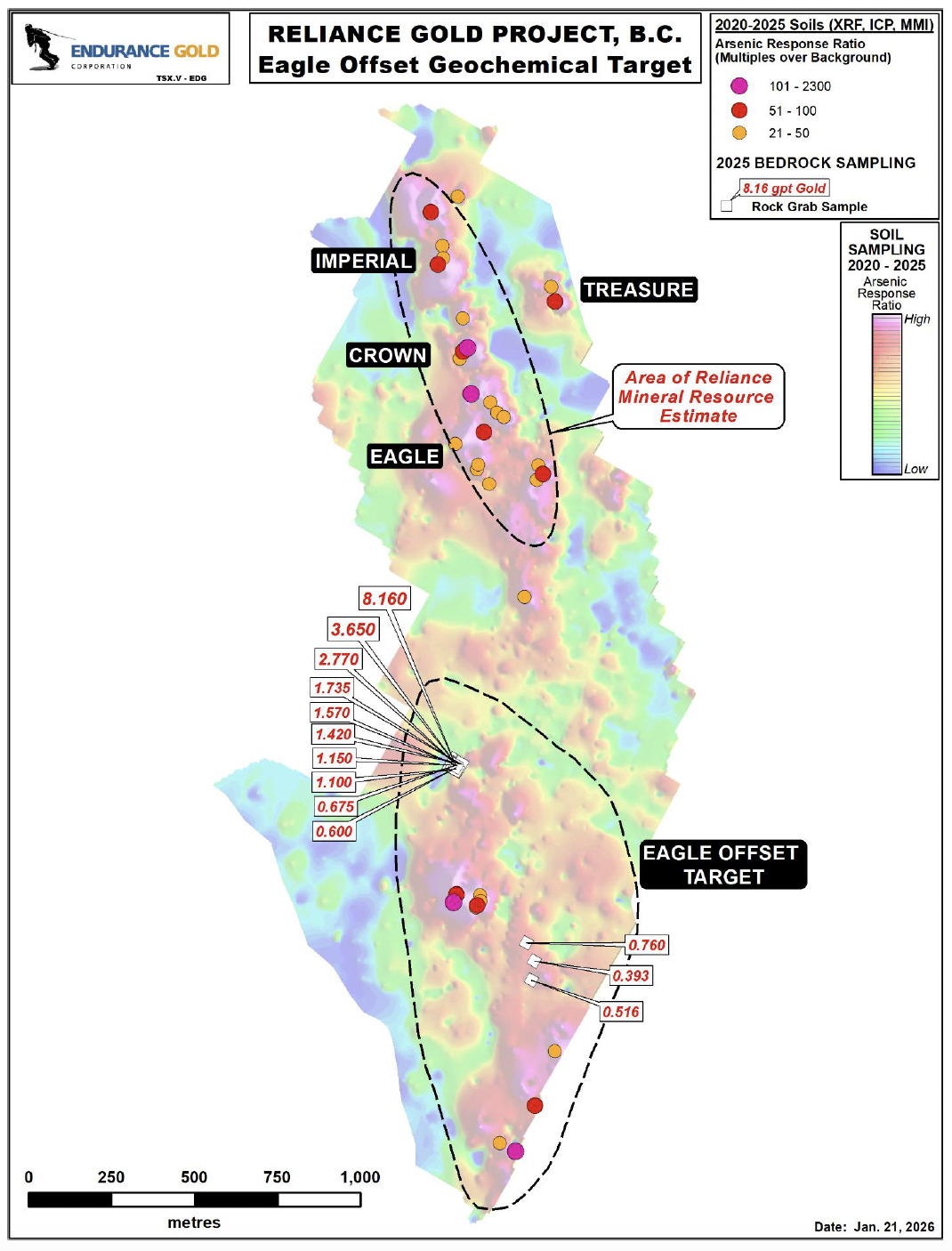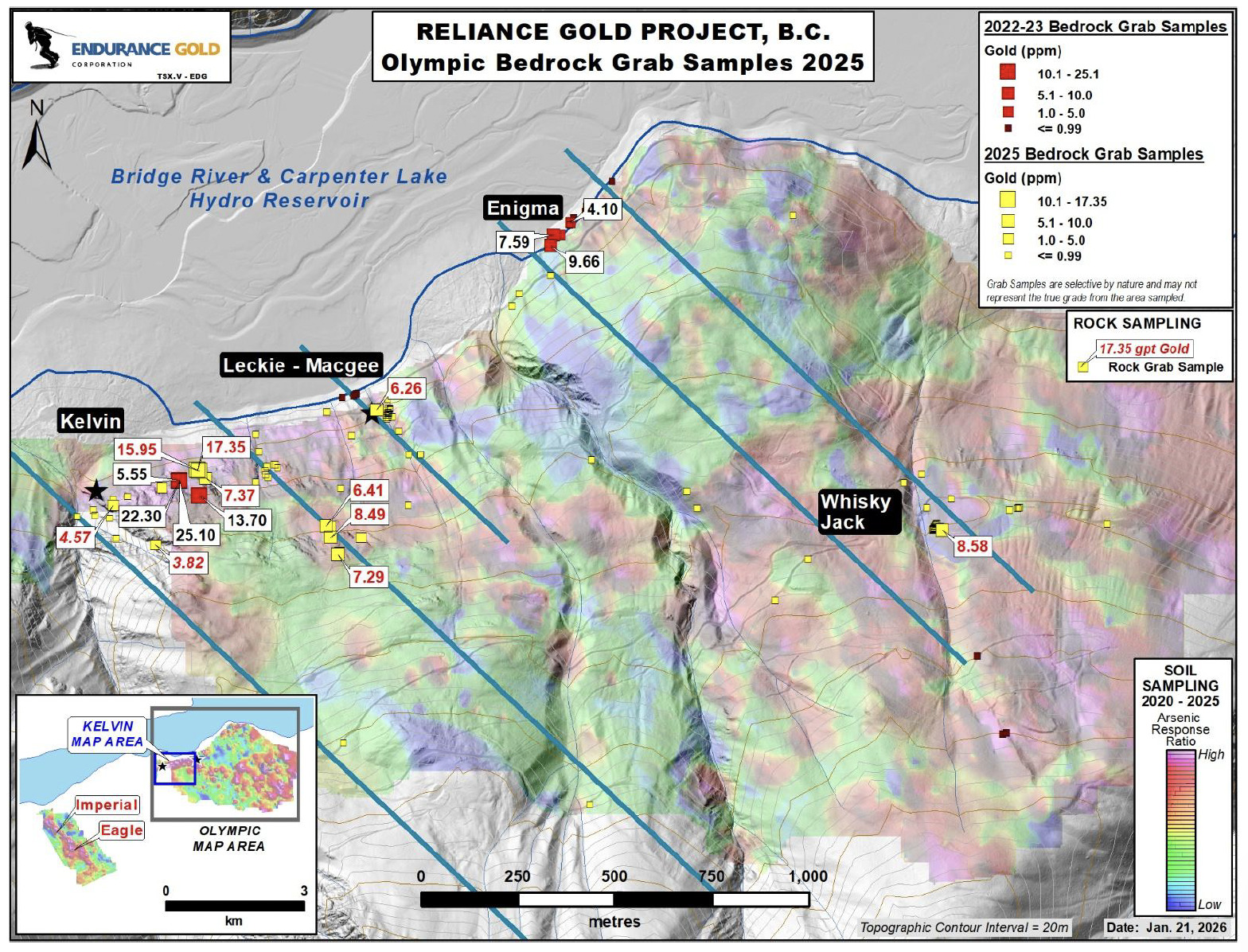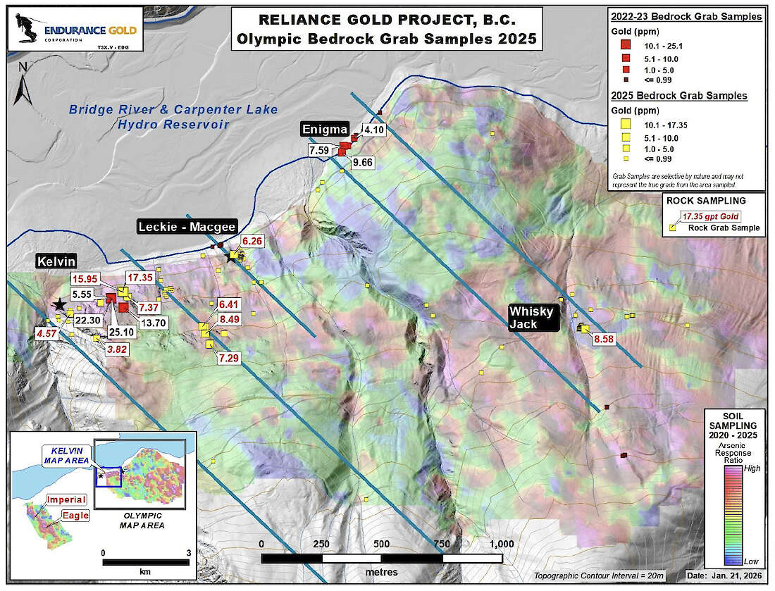 Endurance Gold Corporation ((TSXV:EDG; OTCQB:ENDGF; FRA:3EG) (the “Company”) is pleased to announce results from prospecting and soil sampling surveys conducted on its 100%-owned Reliance Gold Project (the “Reliance Project” or “Project”) during the 2025 season. The road accessible Project is located 4 kilometres (“km”) east of the village of Gold Bridge within the historic Bridge River Mining Camp.
