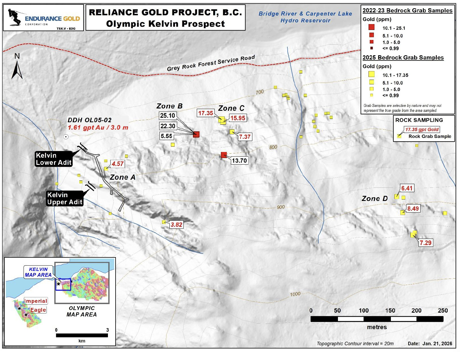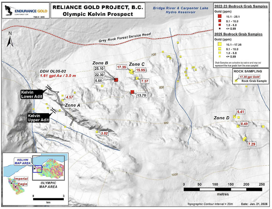 Figure 4: Olympic Kelvin Prospect Detail: Bedrock Grab Sample Results