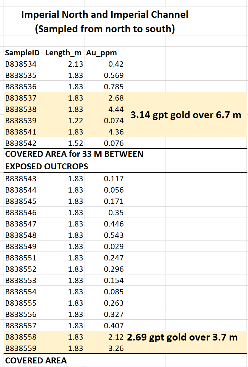 The 2020 channel sample results for the Imperial North and Imperial Zone outcrops are now complete and summarized above. The Imperial North outcrop contains a mineralized shear strand which returned 3.14 grams per tonne ("gpt") gold over 6.7 m. This outcrop was previously chip sampled and returned 10 gpt gold over 5 m as reported in December 2019. Imperial North is interpreted to be a sub-parallel shear strand to the Imperial Zone. The Imperial Zone does not outcrop but is interpreted to have been partially identified in 2020 channel sampling which returned 2.69 gpt gold over 3.7 m before the outcrop disappears under cover. The last program of drilling in 2008 targeted the Imperial Zone and returned highlight drill intersection widths including 13.30 gpt gold over 4.20 m (est 1.8m true width) at depth on this Zone. The Crown channel sample results returned a maximum value of 1.22 gpt gold over 0.6 m. These results did not identify the source of the three contiguous 2020 soil samples at Crown that ran 11,000 ppb, 2,560 ppb and 1,190 ppb gold. There were no significant values from channel sampling at the Merit outcrop.
