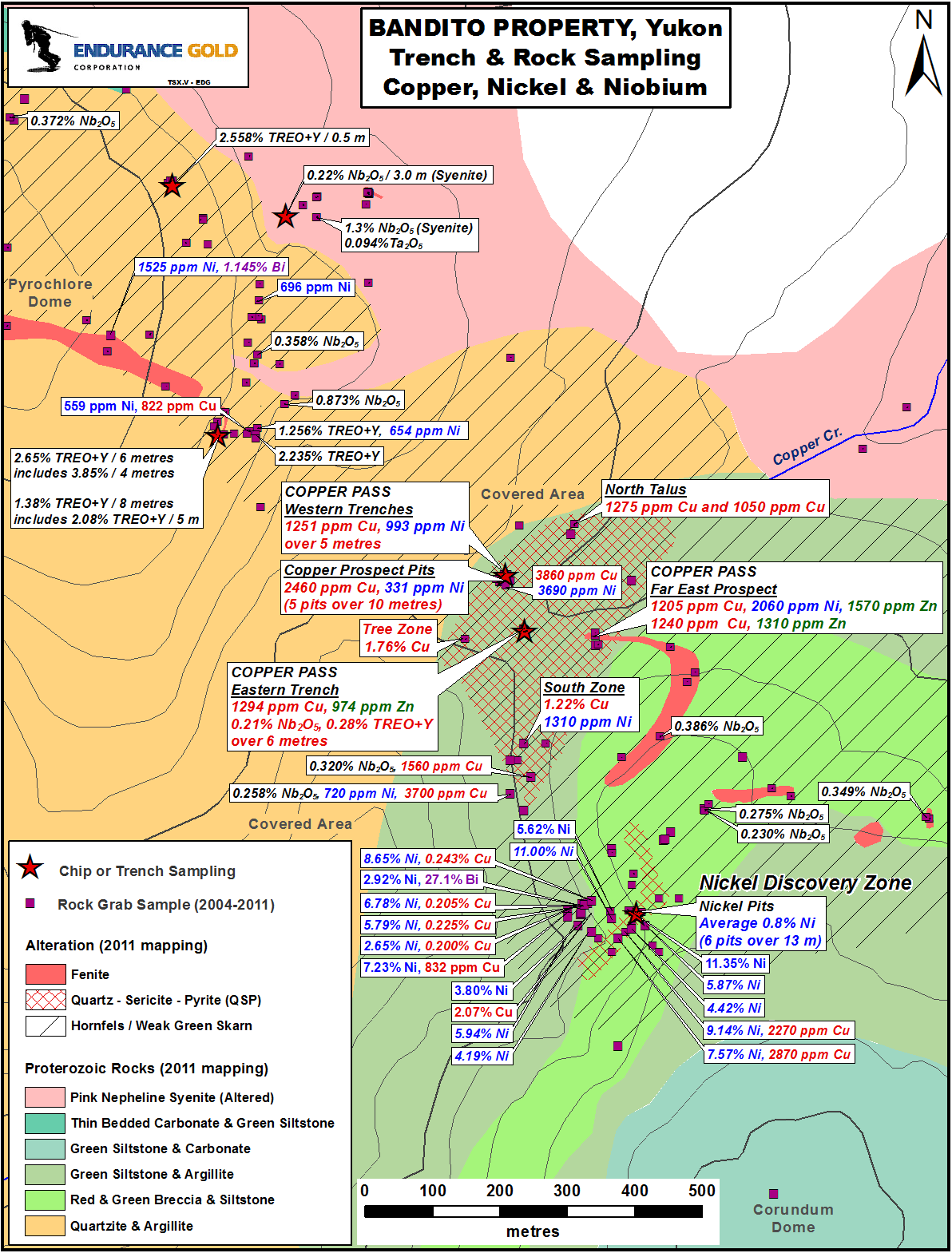 Rare Earth Highlights -- The most significant prospects sampled in 2012 were related to follow-up prospecting of the large REE-Niobium syenite-hosted soil anomaly discovered in 2011. Highlights of 2012 bedrock grab and float samples include: