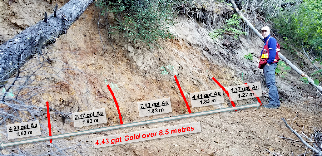 2020 Exposed Imperial North Zone -- Channel sample of 4.1 gpt Gold / 3.7 m in area sampled in 2019 as 10 gpt Gold / 5.0 m