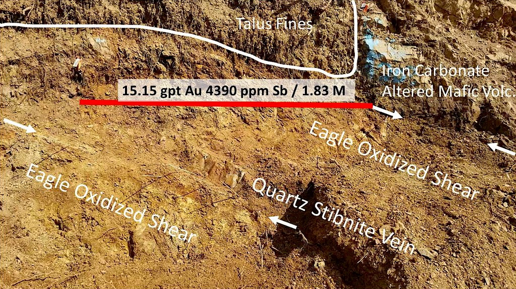 Enigma Showing Quartz-Stibnite Vein (9.66 gpt Gold, 11.9% Antimony)